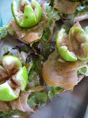 Por cima colocar folhas de alface e de seguida um pouco de salmão. Por fim, finalizar com um figo cortado em quatro em cima de cada fatia.